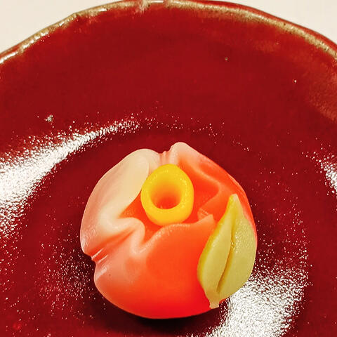 姫椿(練りきり) 白ぼかし赤色の練りきりで白こし餡を包み木べらを用い...