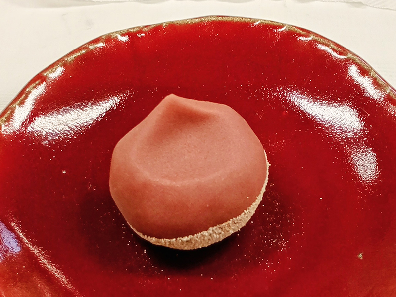 小豆餡の練りきりで白こし餡を包み手作業で形を整え煎った上南粉をつけた上品な甘さが特徴の生菓子です、9月から10月にかけて旬を迎える熟した栗の実を表現しました。
