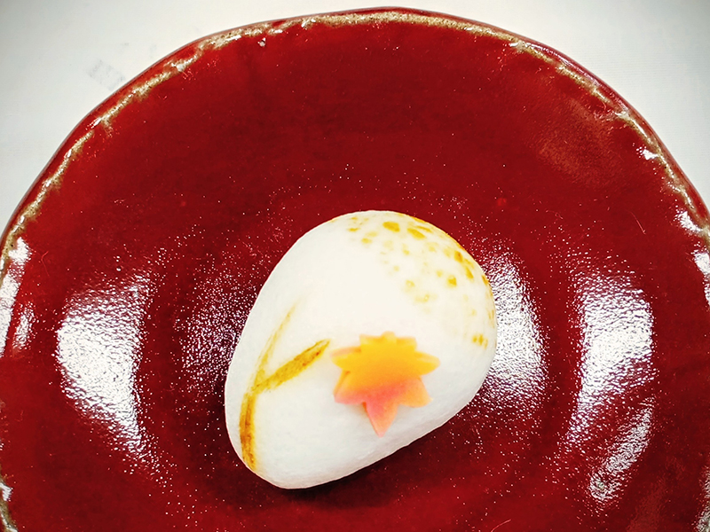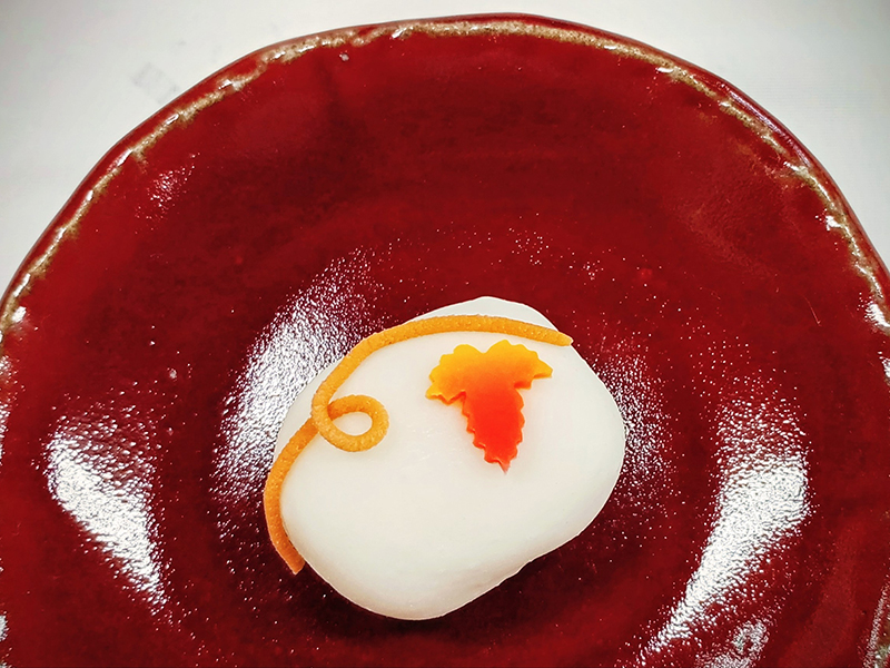 雪平生地で白こし餡を包み俵型に形を整え練りきりの蔦と葉を飾り、山野の木々等に鮮やかに紅葉する蔦紅葉を表現しました。