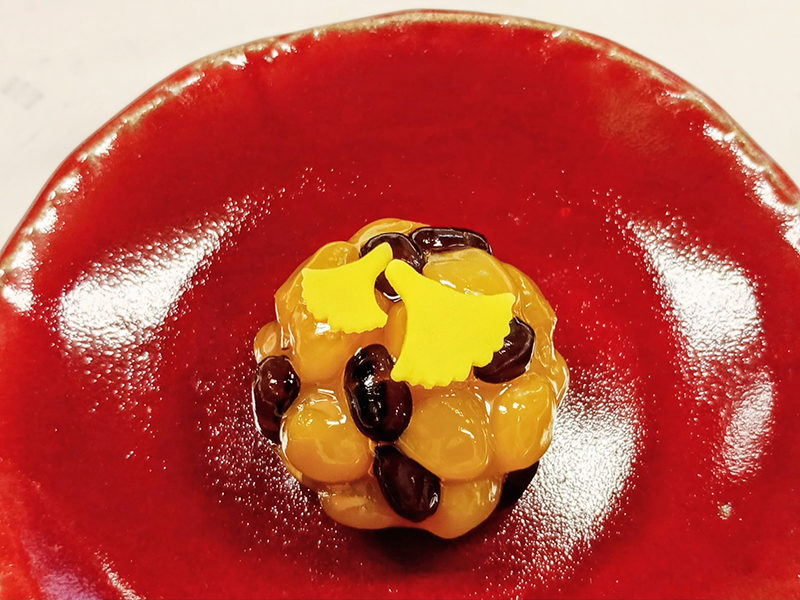 うぐいす豆と大納言小豆の鹿の子で中餡は白こし餡です、練りきりの葉を飾り秋が深まり黄金色に紅葉する色鮮やかな銀杏並木を表現しました。