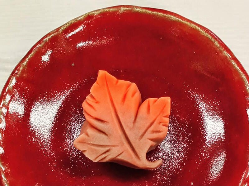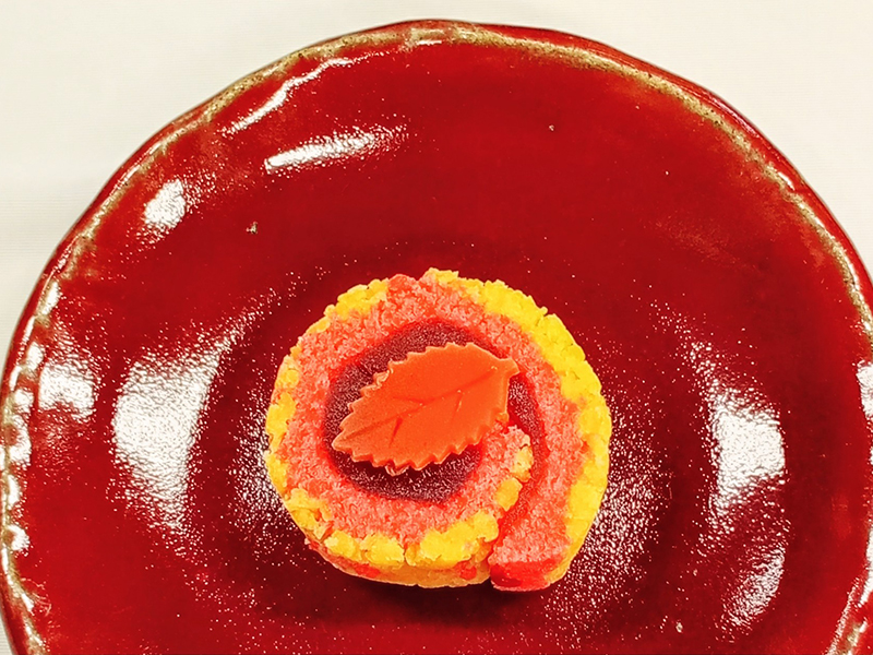 朱色と黄色の鮮やかなそぼろ状の村雨生地と半小豆の羊羹で巻物に仕上げました、練りきりの葉を飾り錦のように美しく紅葉する晩秋の野山を表現しました。