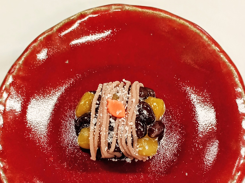 白こし餡に大納言小豆とうぐいす豆を貼り付けるように手作業で形を整えました、上面に紐状の練りきりと葉を飾り氷餅を散らし晩秋から初冬にかけて冬の訪れを表現しました。