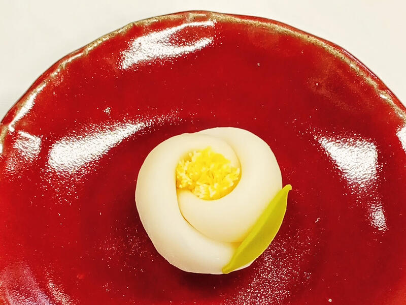 雪平生地で白こし餡を包み手作業で形を整え練りきりのシベと葉を飾り、花の少ない寒い季節に色鮮やかに咲き誇る山茶花の花を表現しました。