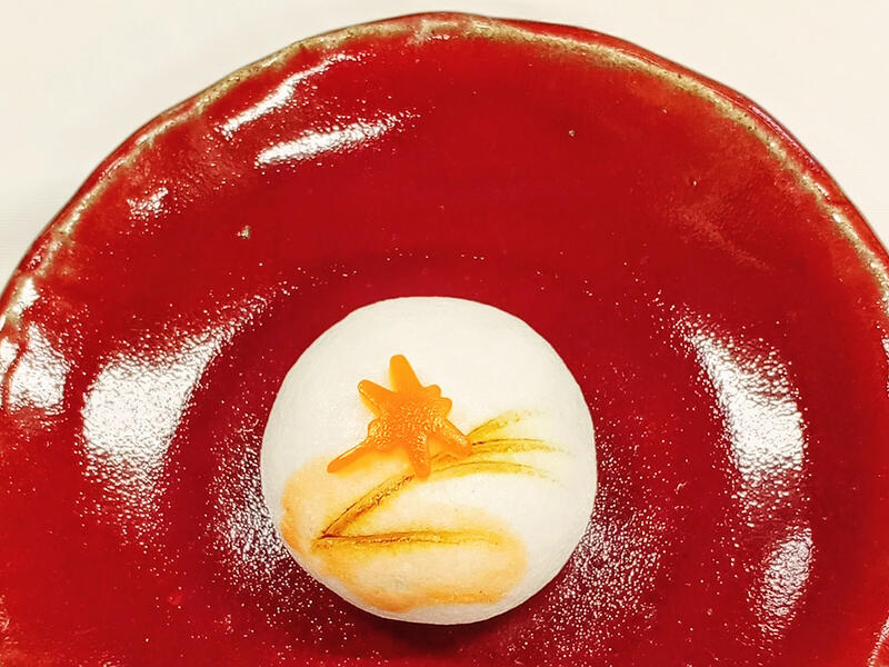 小豆練りきりを朱色でぼかした生地で白こし餡を包み木べらを用い手作業で形を整えました、晩秋から初冬にかけて冬の訪れを知らせる木枯らしを表現しました。