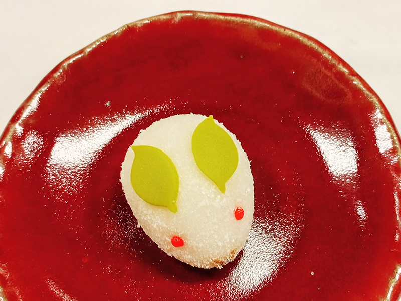 雪平生地で白こし餡を包み表面に氷餅粉をまぶし手作業で形を整えました、練りきりの耳と羊羹の目を飾り晩冬の生活季語である雪うさぎを表現しました。
