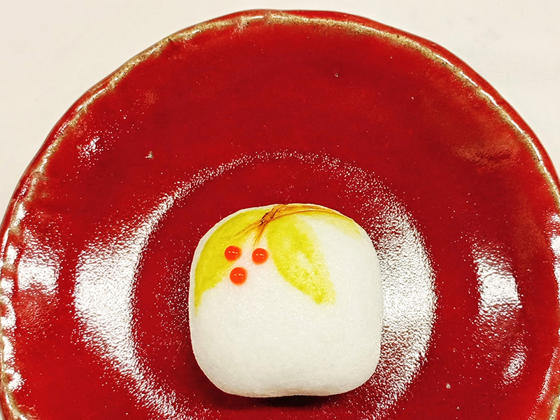 上質な山芋をすり下ろしたしっとりとした食感が特徴の上用饅頭になります、中餡は小豆こし餡で焼きごてで線を引き羊羹の実を飾り冬の季節を彩る南天の実を表現しました。