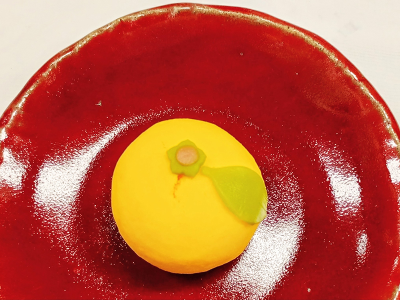 黄身餡を用いた生地で白こし餡を包み蒸し上げた口溶けの良さが特徴の生菓子です、冬至の頃に強い香りで柚子湯として用いられる柚子の実を表現しました。