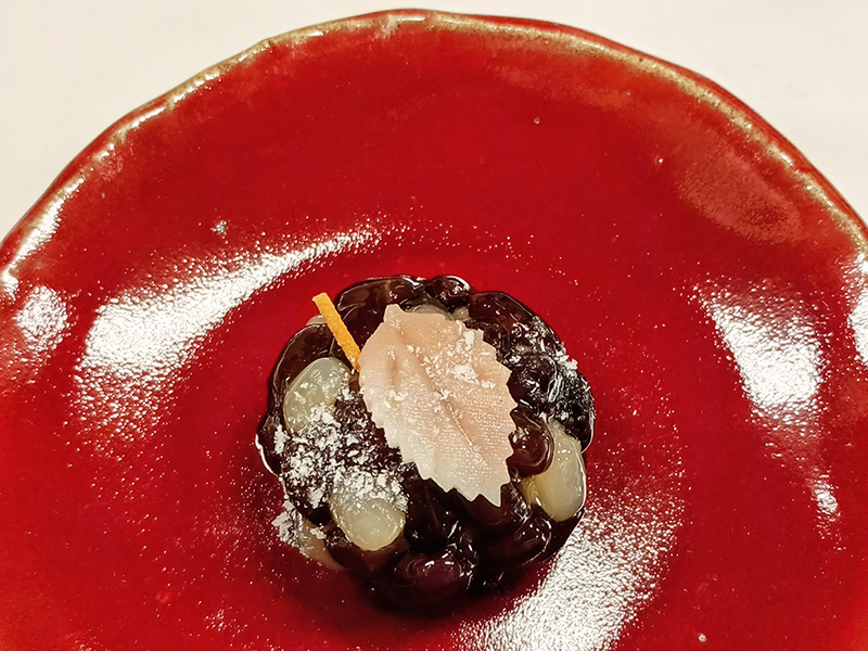 白こし餡に大納言小豆と白小豆を貼り付け形を整えました、上面に練りきりの葉と氷餅粉を飾り冬の到来を実感させる草木に白く降りた霜の様子を表現しました。