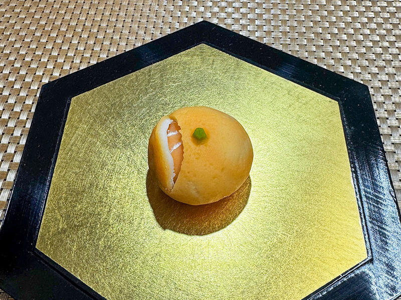 中餡のみかんの実はヘラですじを1本ずつ入れ、そこに澱粉をつけます。それを包み、みかんの皮をはぐことにより、みかんにある白いすじをあらわしています。