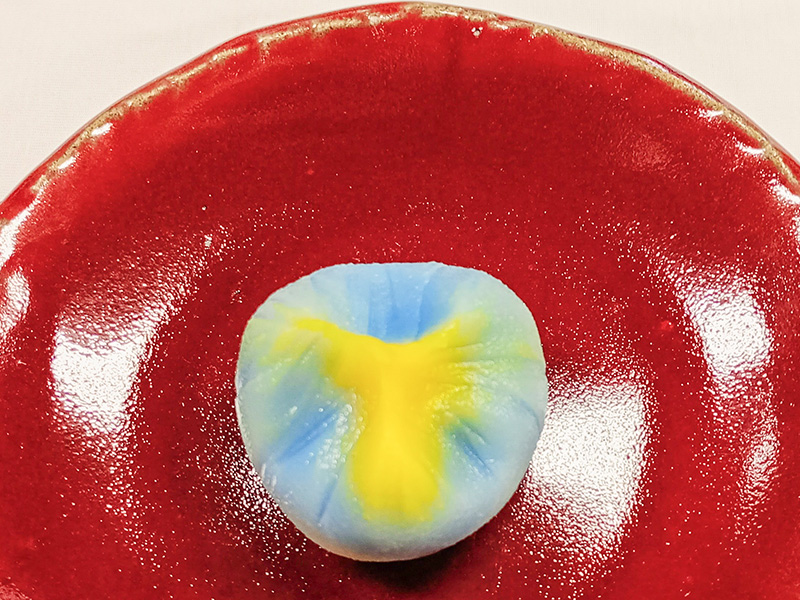 紫色、白、黄色の3色をぼかした練りきりで白こし餡を包み茶巾絞りで形を整えました、小さく控えめで可憐な姿で奥ゆかしい早春の風情を表現する(すみれ)の花を表現しました。
