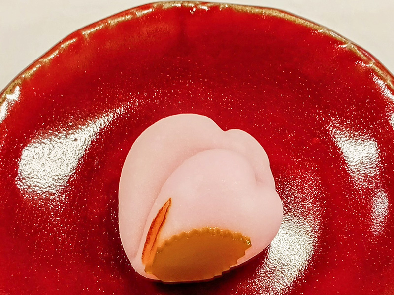 淡紅色の雪平生地で白こし餡を包み木べらを用い手作業で形を整えました、焼きごてで枝を表し羊羹の葉を飾り3月から4月にかけて満開の時期を迎える春を代表する桜の花を表現しました。