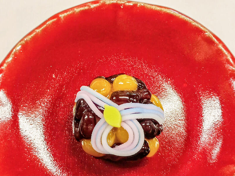 白こし餡にうぐいす豆、大納言小豆を貼り付けるように手作業で形を整えました、上面に紐状の練りきりと葉を飾り川や湖の温度が少しづつ上がり温もりを感じる春の暖かい情景を表現しました。
